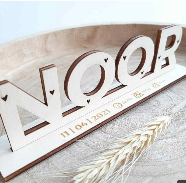 Houten naam in een staander met geboortegegevens, een ideaal kraamcadeau, doopgeschenk of als unieke decoratie voor je eigen baby.