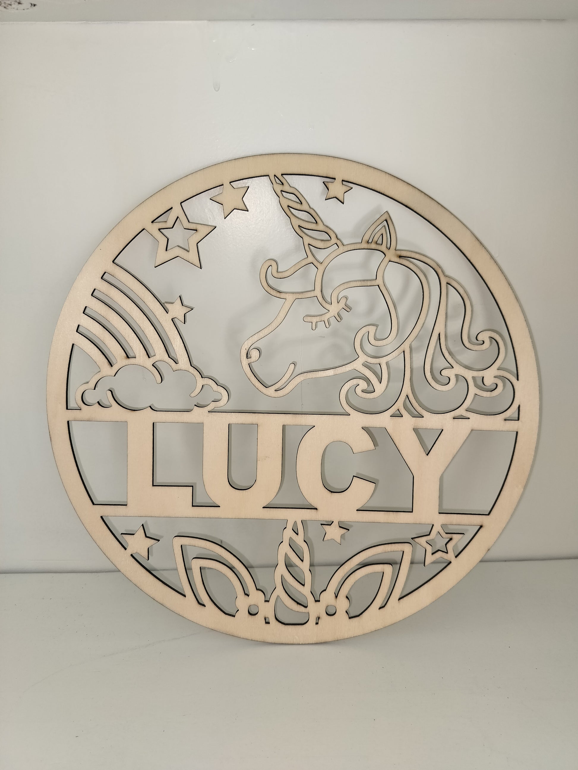 Ontdek onze naamcirkel met een unicornthema, perfect voor het personaliseren van kinderkamers, klaslokalen en speelruimtes.